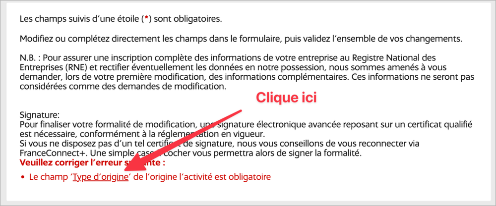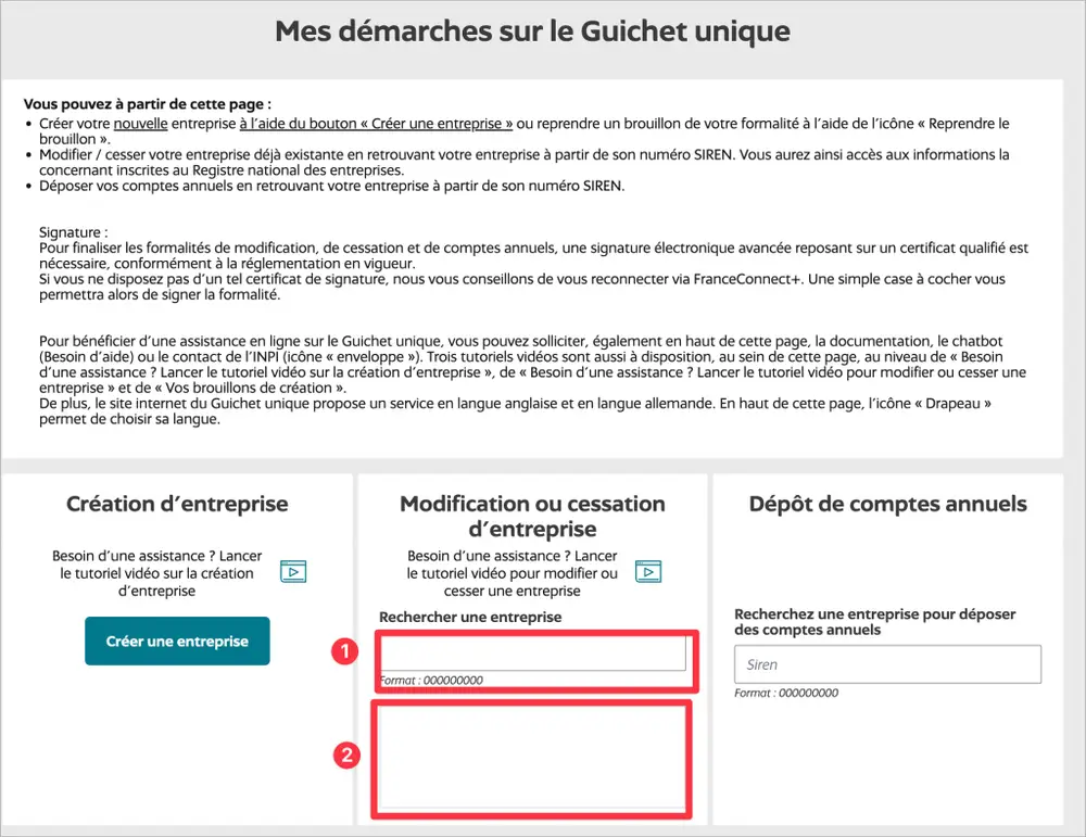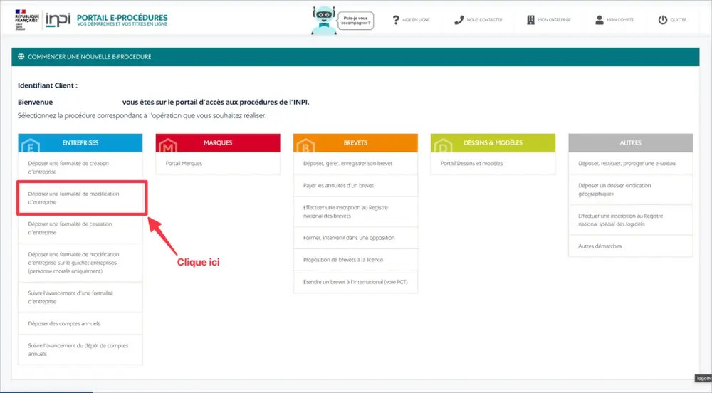 - Clique sur « Déposer une formalité de modification d’entreprise ».