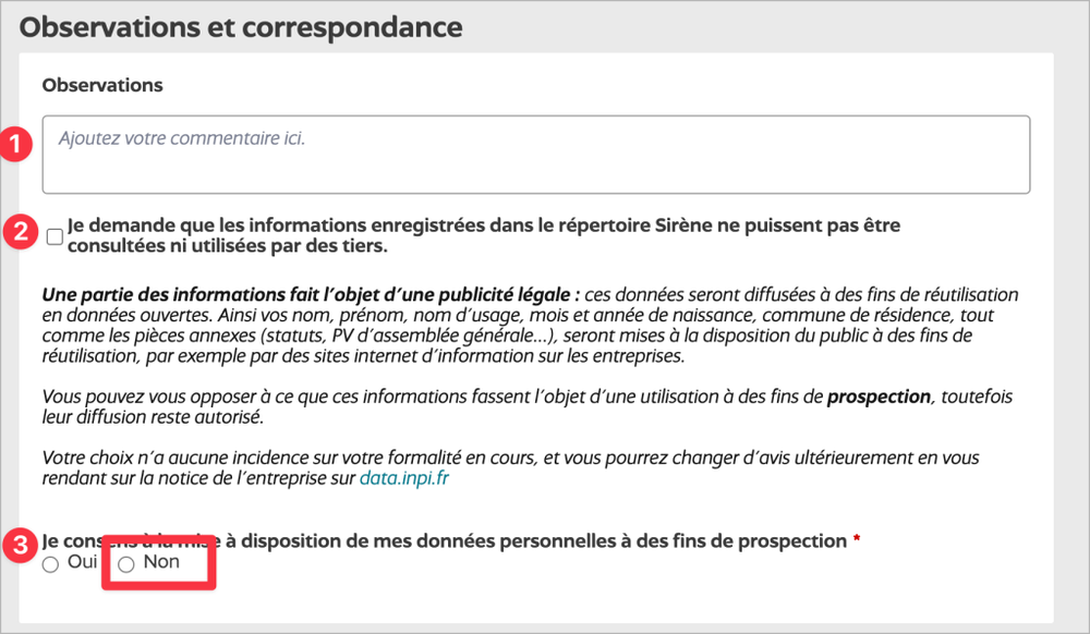 - Coche « Non » à la case (3) : « Je consens à la mise à disposition de mes données personnelles à des fins de prospection. »