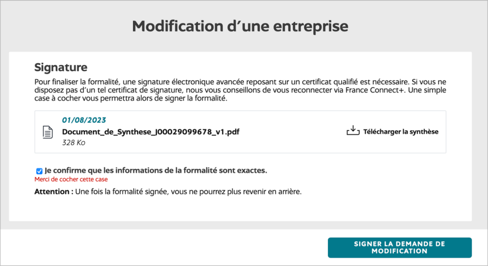 - Coche la case : « Je confirme que les informations de la formalité sont exactes. »