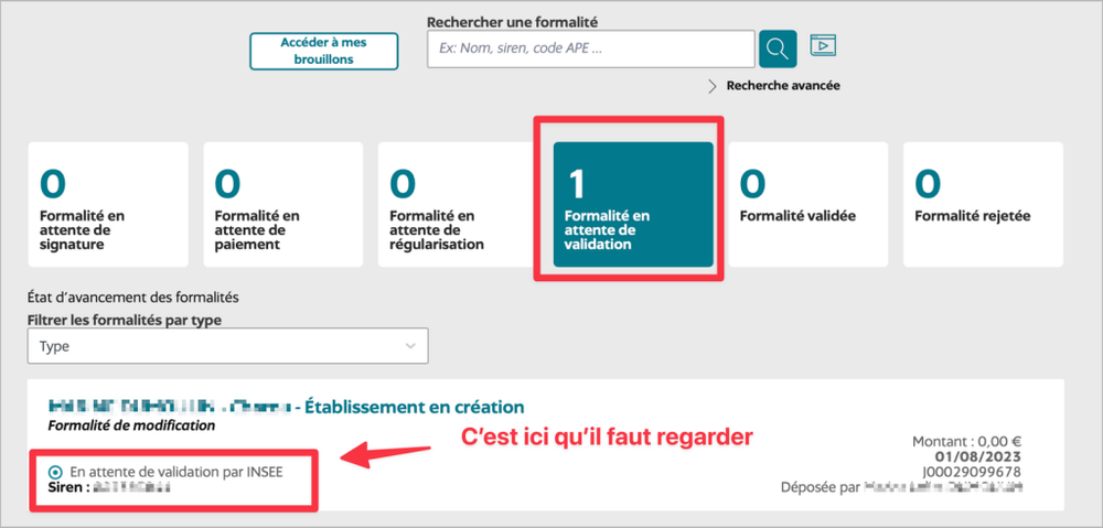 ℹ️ Cela peut prendre 3 jours comme 2 semaines, donc pense à t’y rendre de temps en temps pour voir où cela en est, et surtout ton nouveau SIRET.