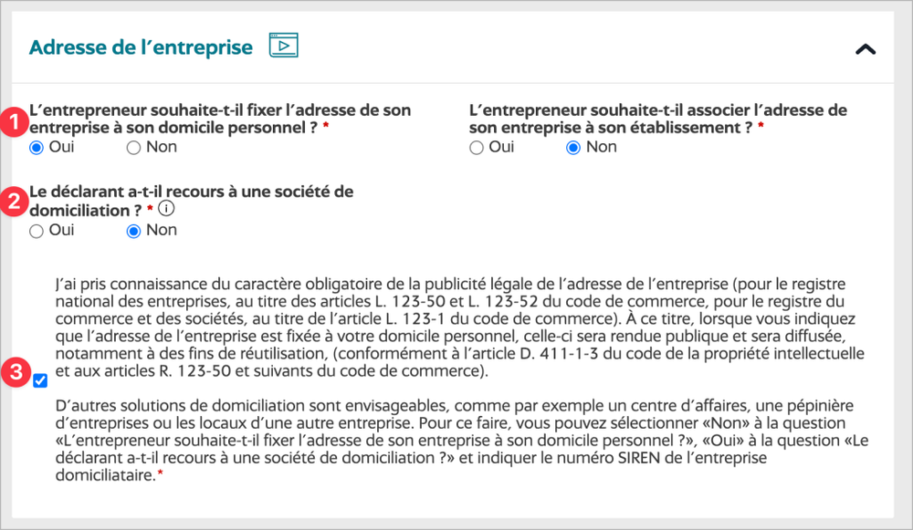 - « L’entrepreneur souhaite-t-il fixer l’adresse de son entreprise à son domicile personnel ? » :